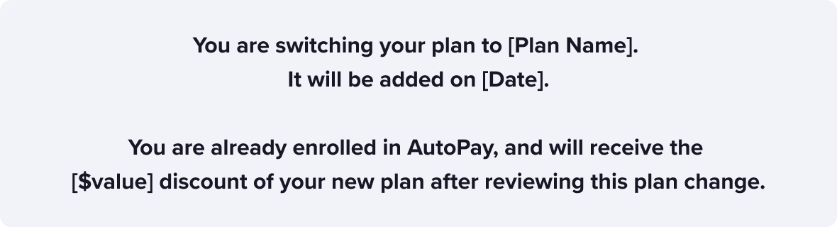 The examples below are in the user case of customers moving from a plan that was not eligible to a discount, to a plan that offers discount on AutoPay.