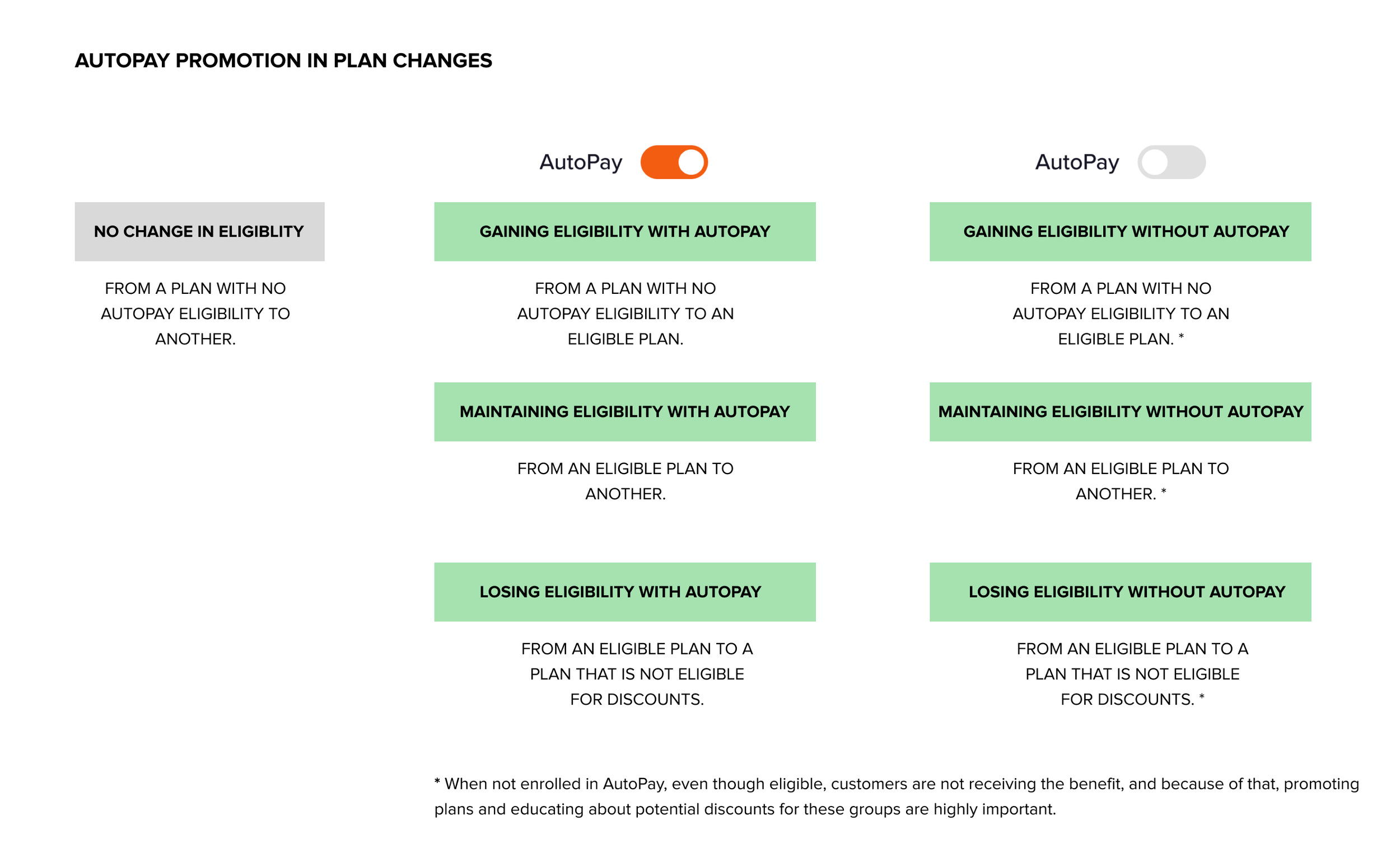 Gaining Eligibility with AutoPay: Customers switching from an ineligible plan to an eligible plan while enrolled in AutoPay. This segment presents an opportunity to highlight available discounts and reinforce the benefits of AutoPay.
