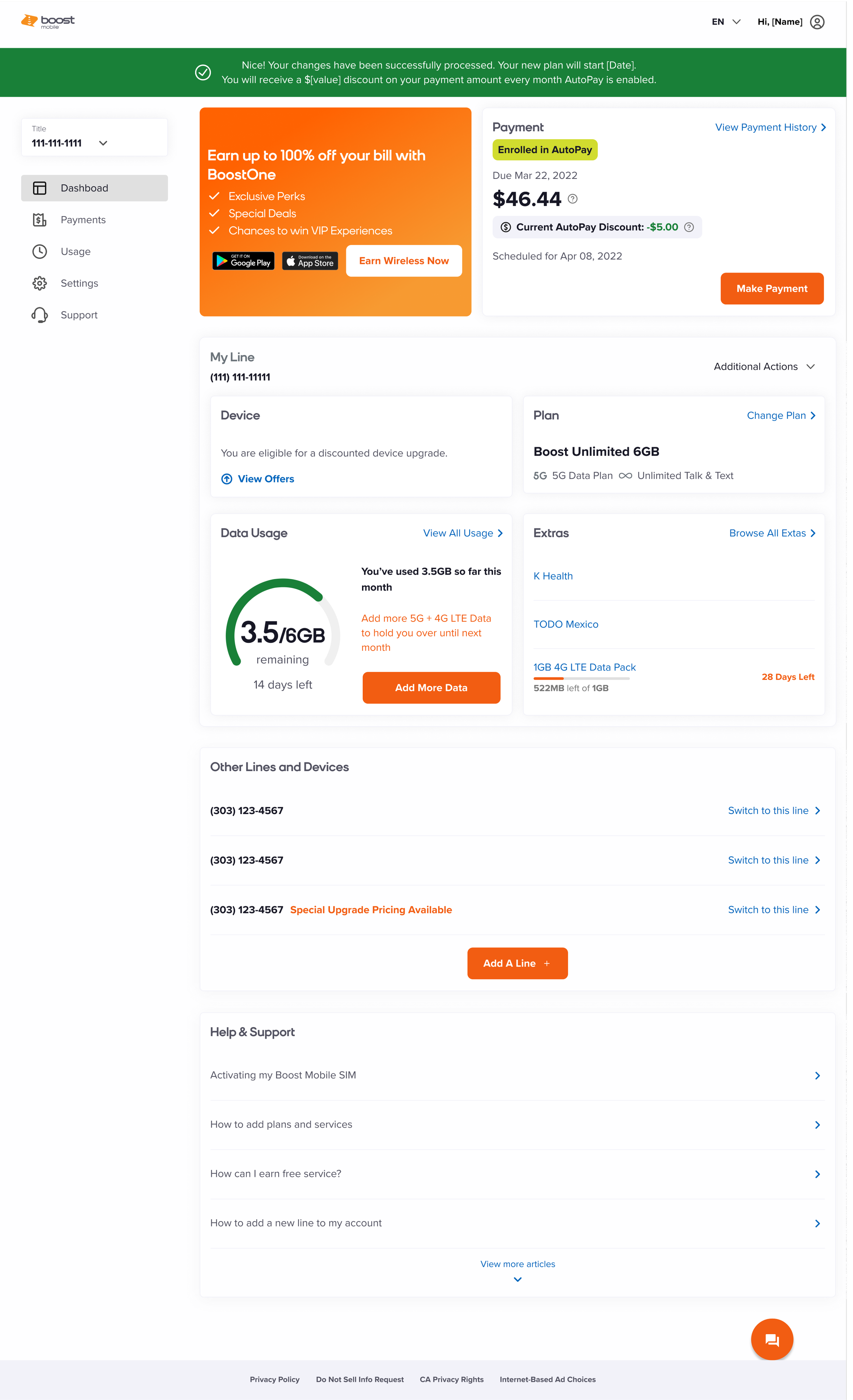 Boost Mobile's self-service tool serves customers, so they can manage their accounts. The dashboard offers a variety of features, for example: changing plans, making payments, upgrading to family plans, and etc.