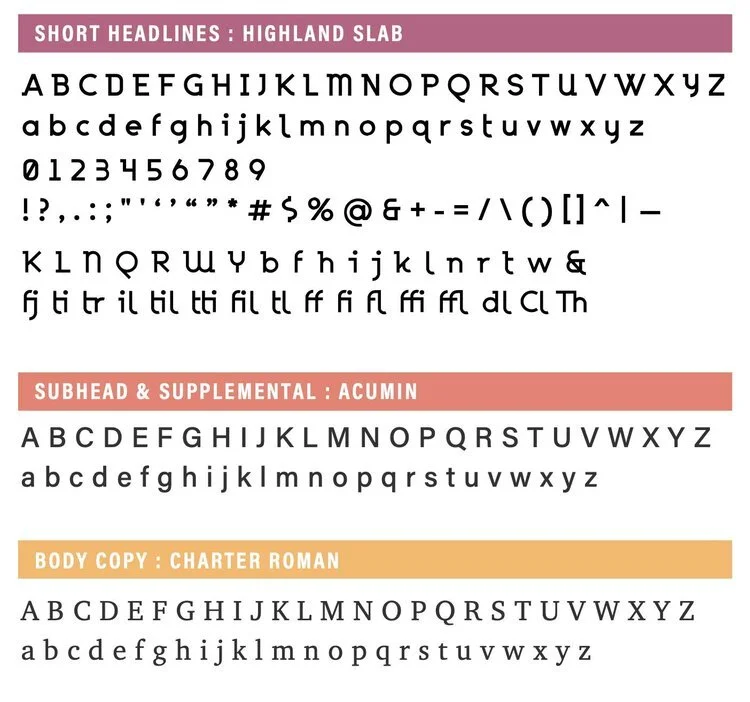 These are the three fonts that can be used for Highland messaging. The Highland font is custom and used for short headlines. Acumin has a variety of weights, which allows for great flexibility. And Charter Roman is a classic, readable body copy font.