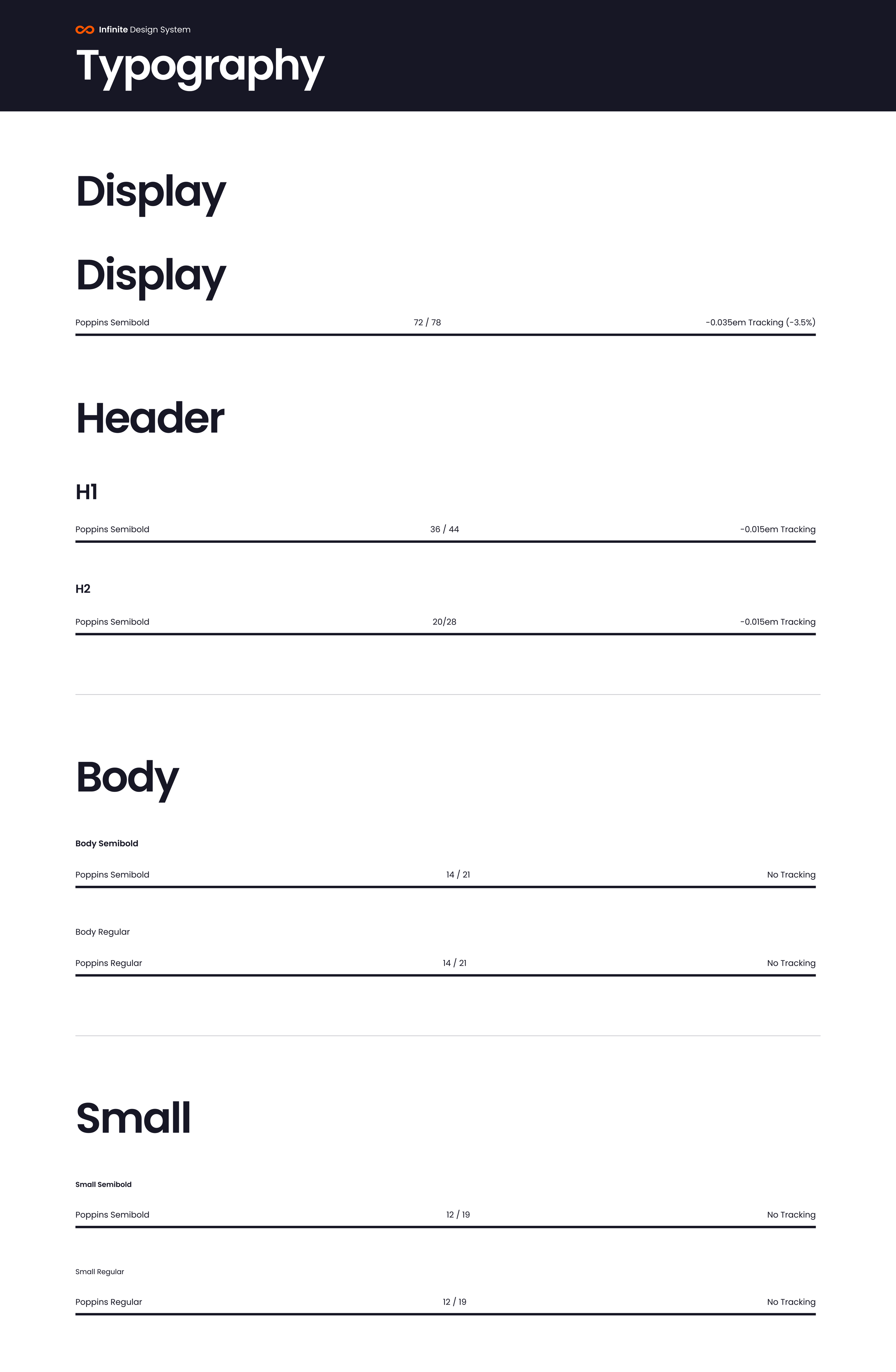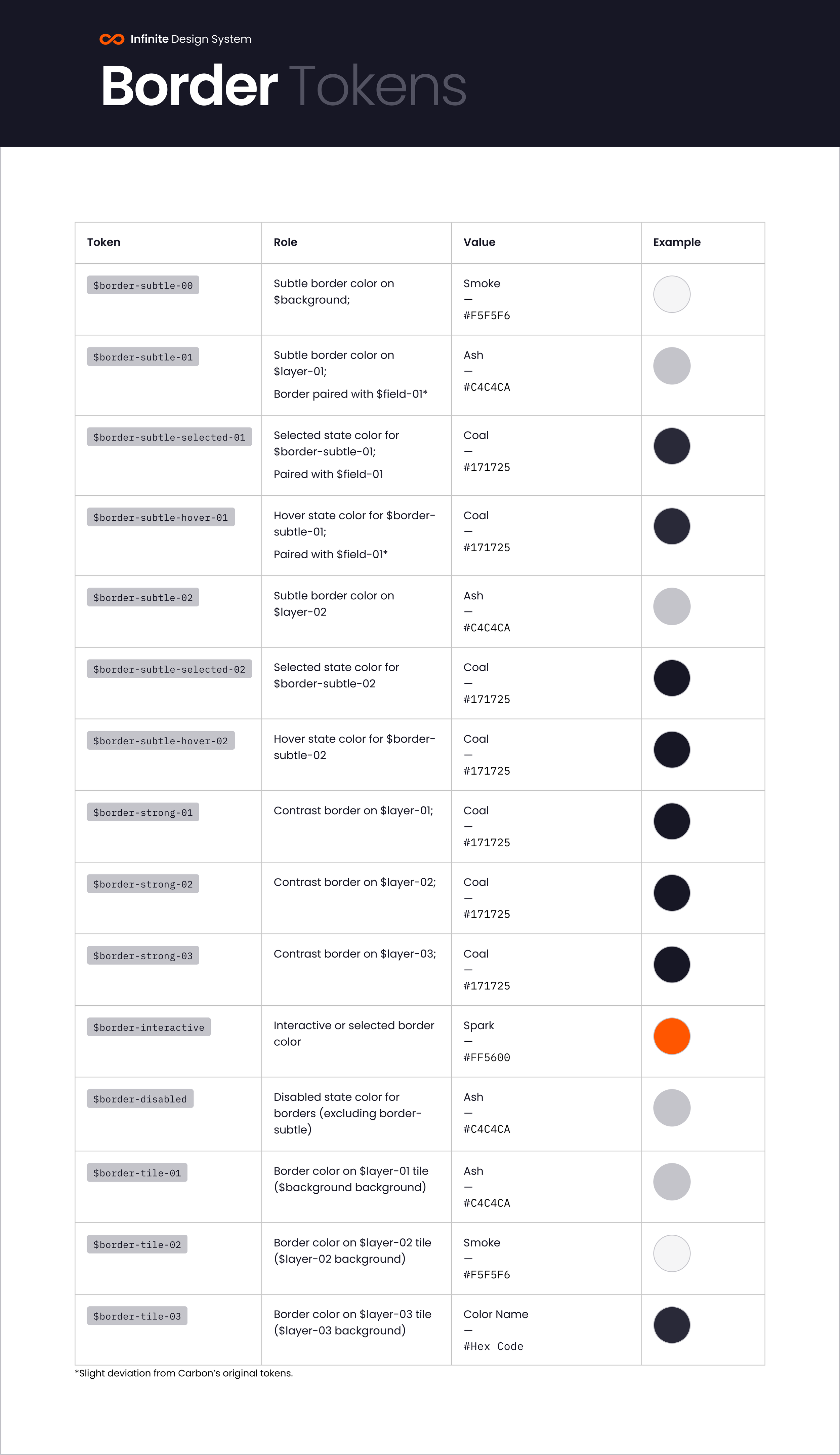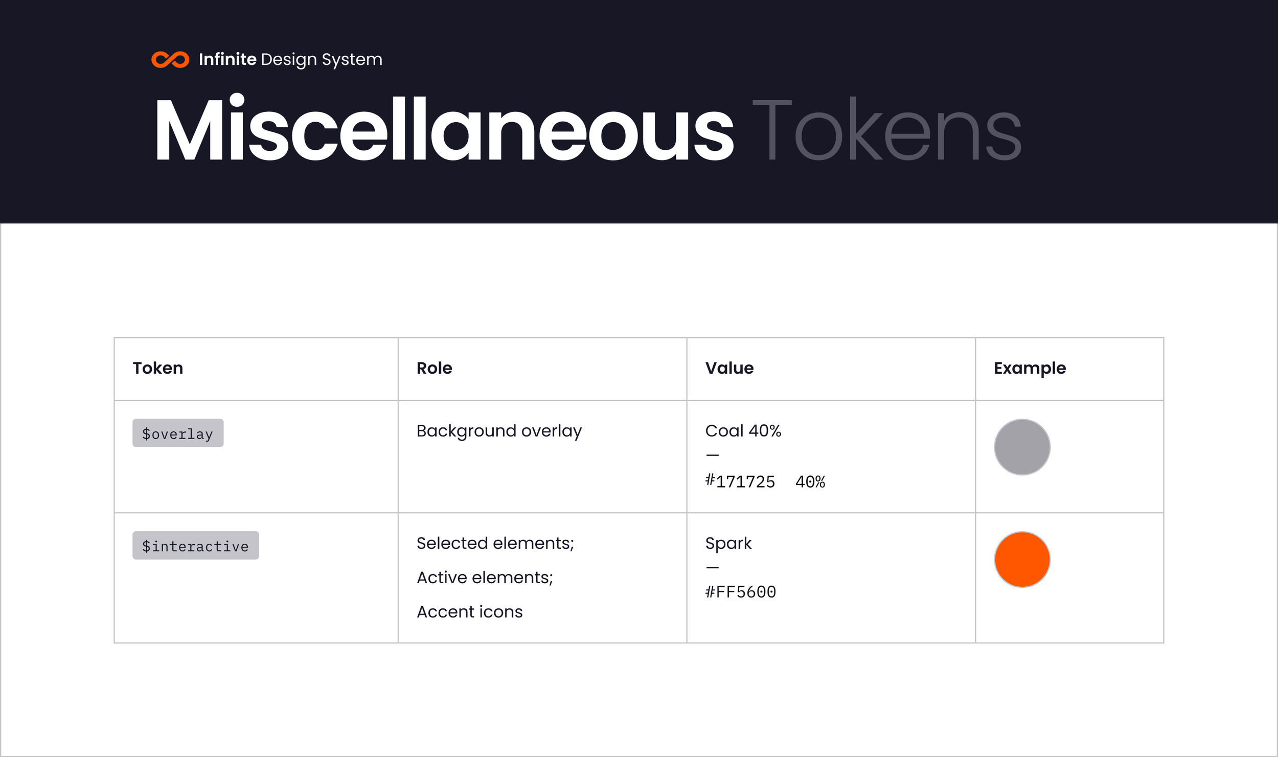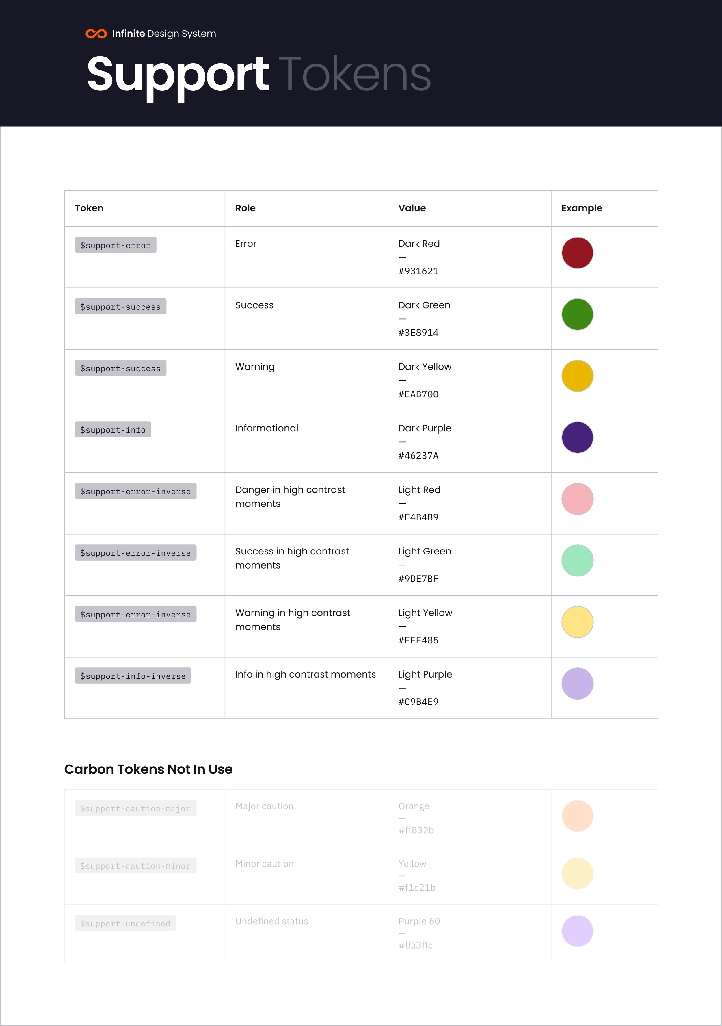 In the process of creating tokens, we based our system on Carbon by IBM. Carbon offered a good amount of preset Tokens that made it easier to adapt our system into. But, by using Carbon, we also had to adapt and add new tokens, as we wanted a very catered design system that feels original and unique to the Infinite brand, while creating a system that supports our team and the distinctive features we needed, that weren't available on Carbon out of the box.