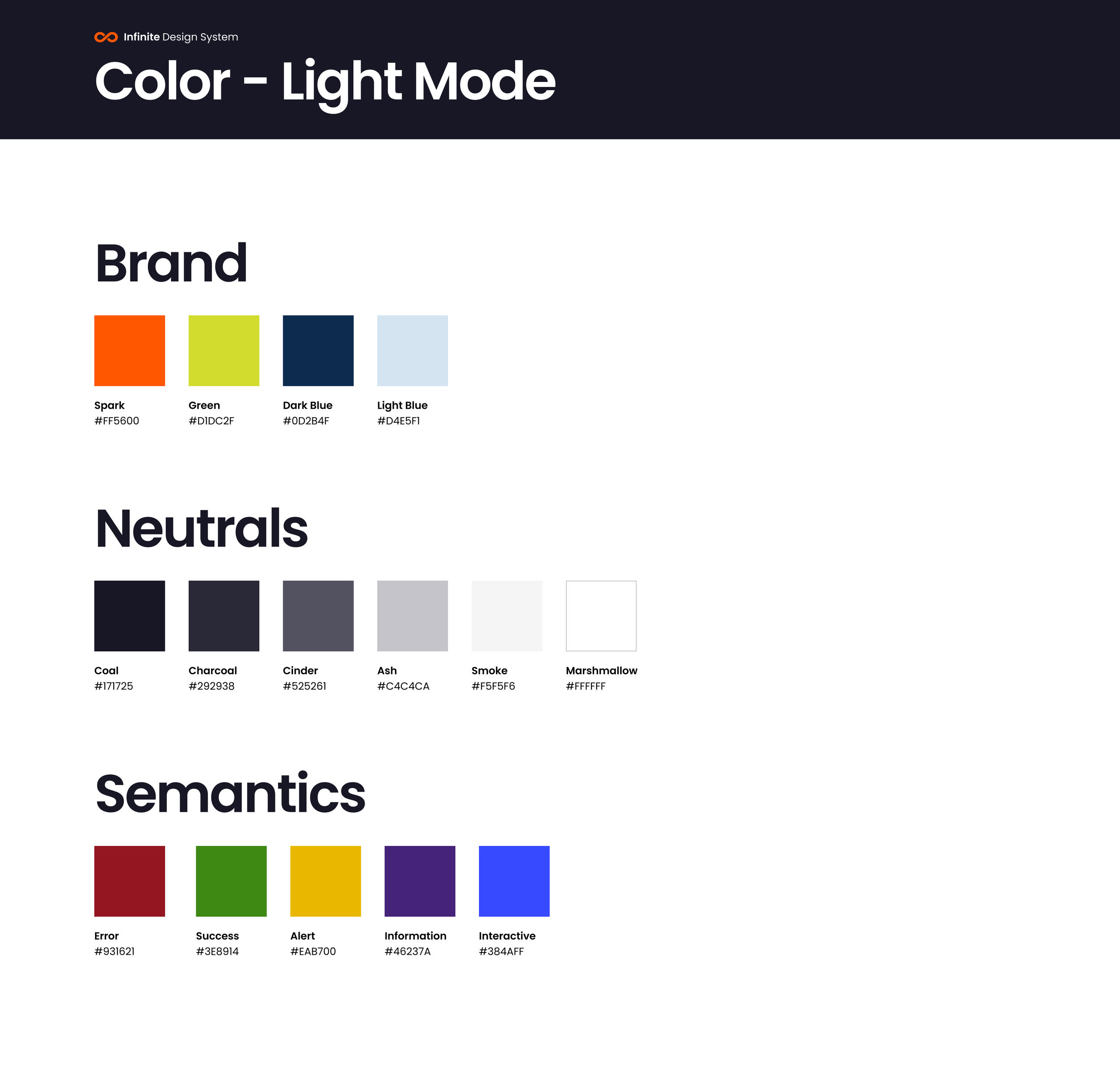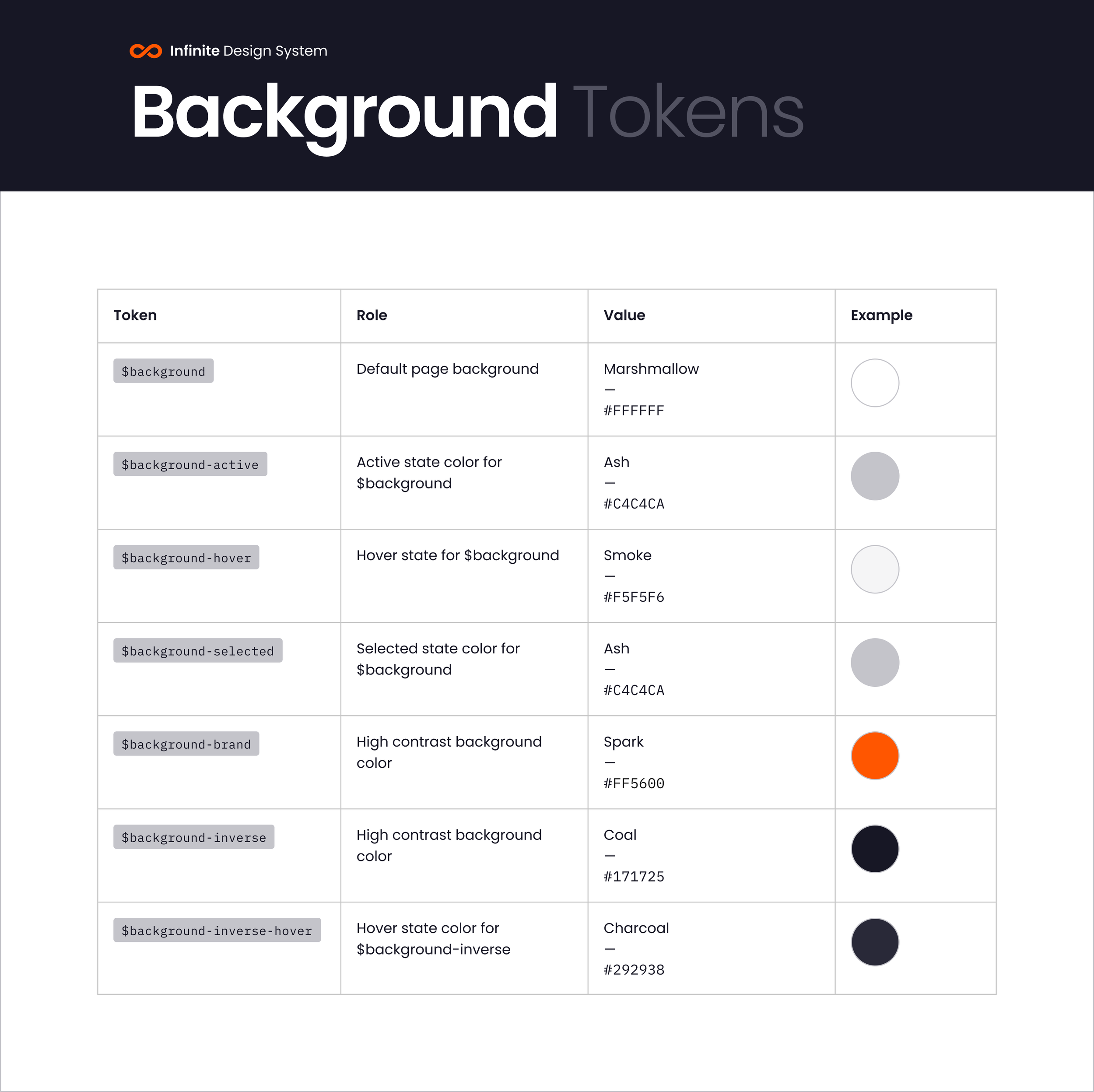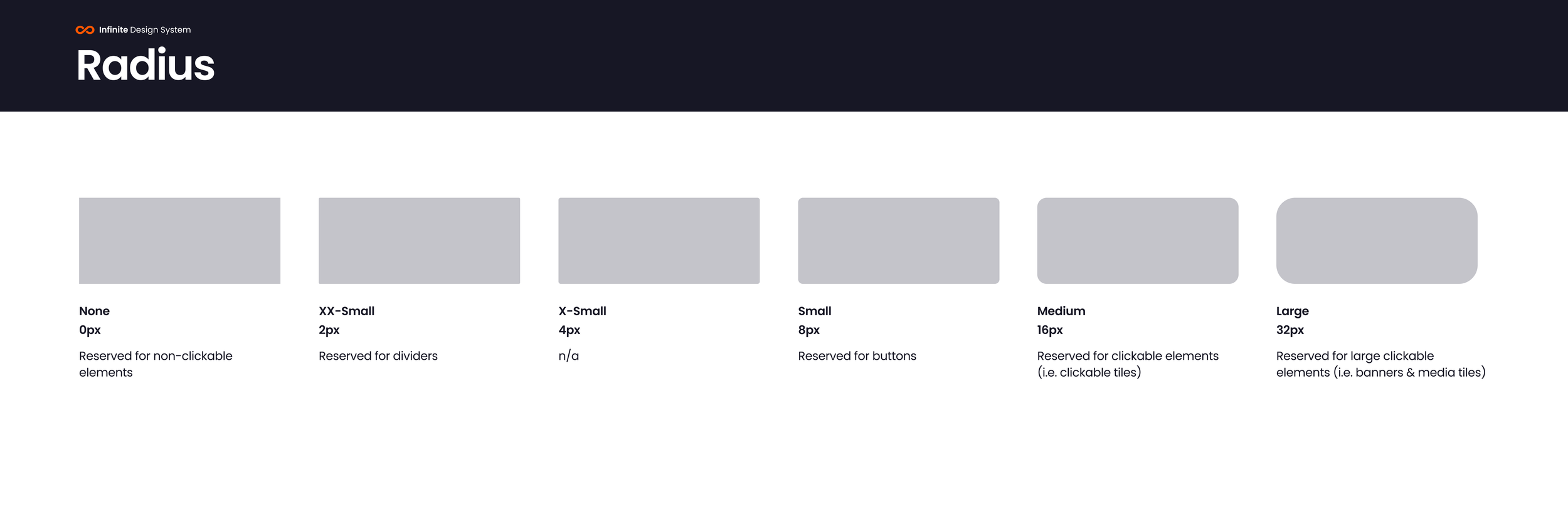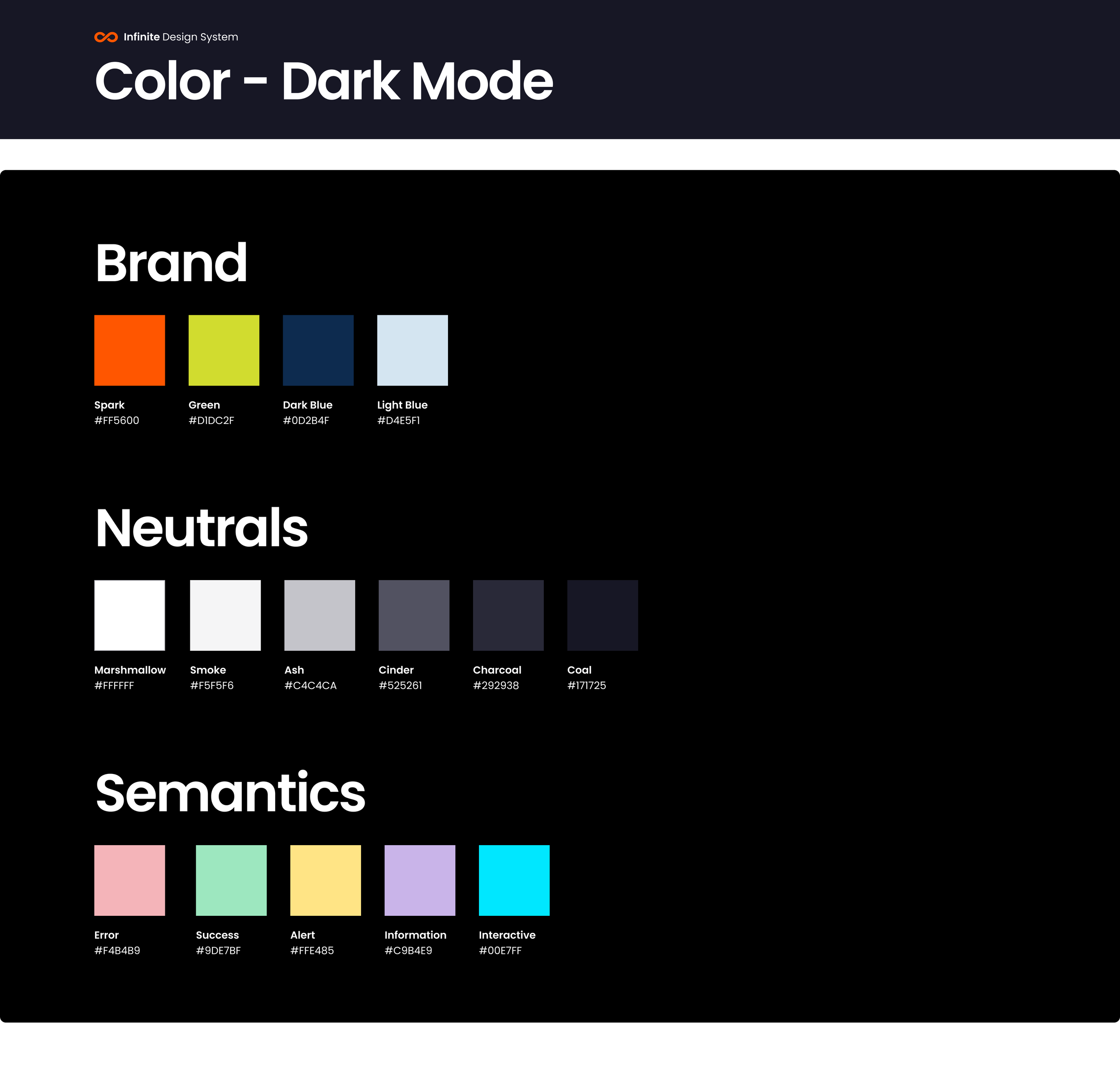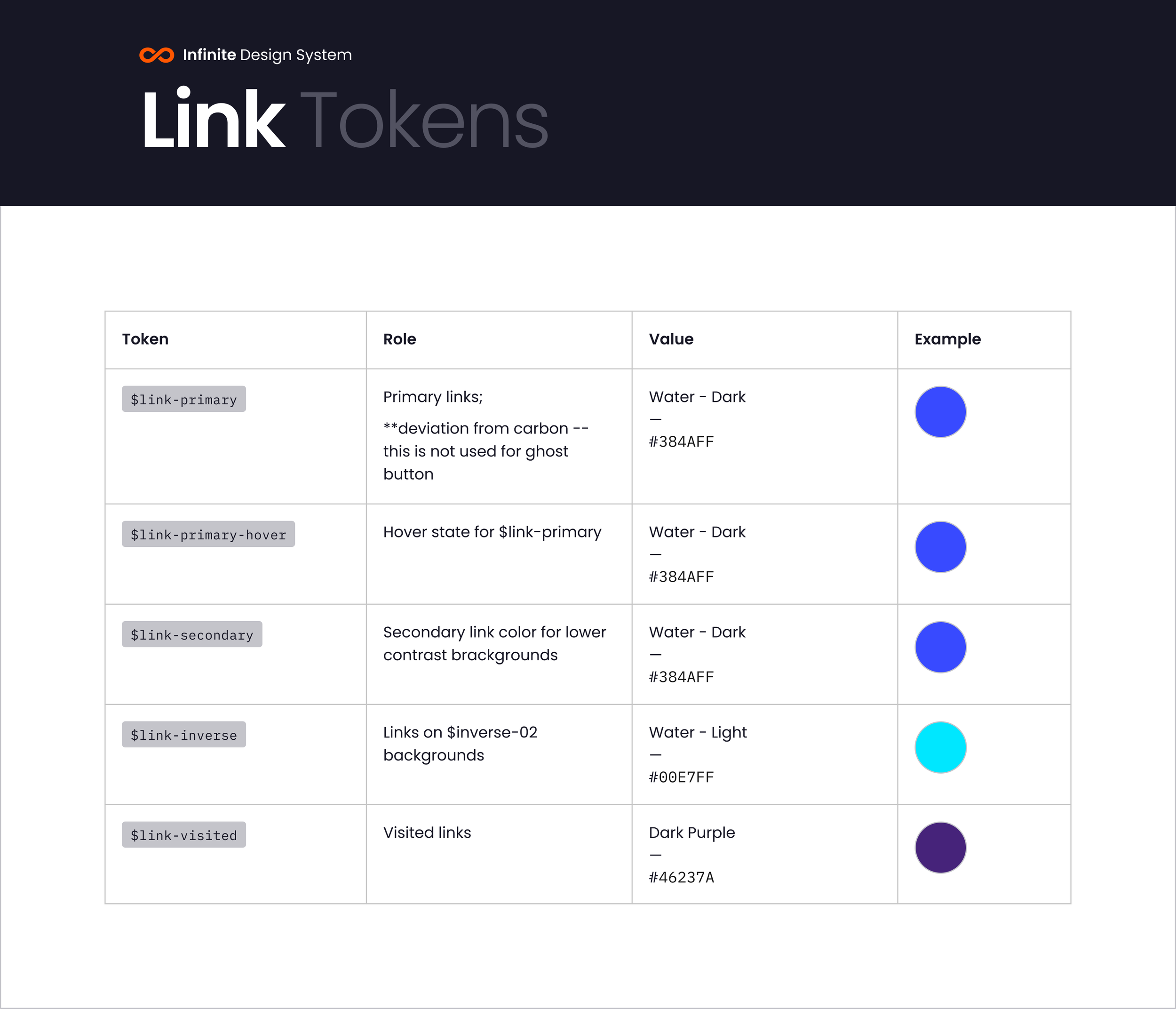 In the process of creating tokens, we based our system on Carbon by IBM. Carbon offered a good amount of preset Tokens that made it easier to adapt our system into. But, by using Carbon, we also had to adapt and add new tokens, as we wanted a very catered design system that feels original and unique to the Infinite brand, while creating a system that supports our team and the distinctive features we needed, that weren't available on Carbon out of the box.