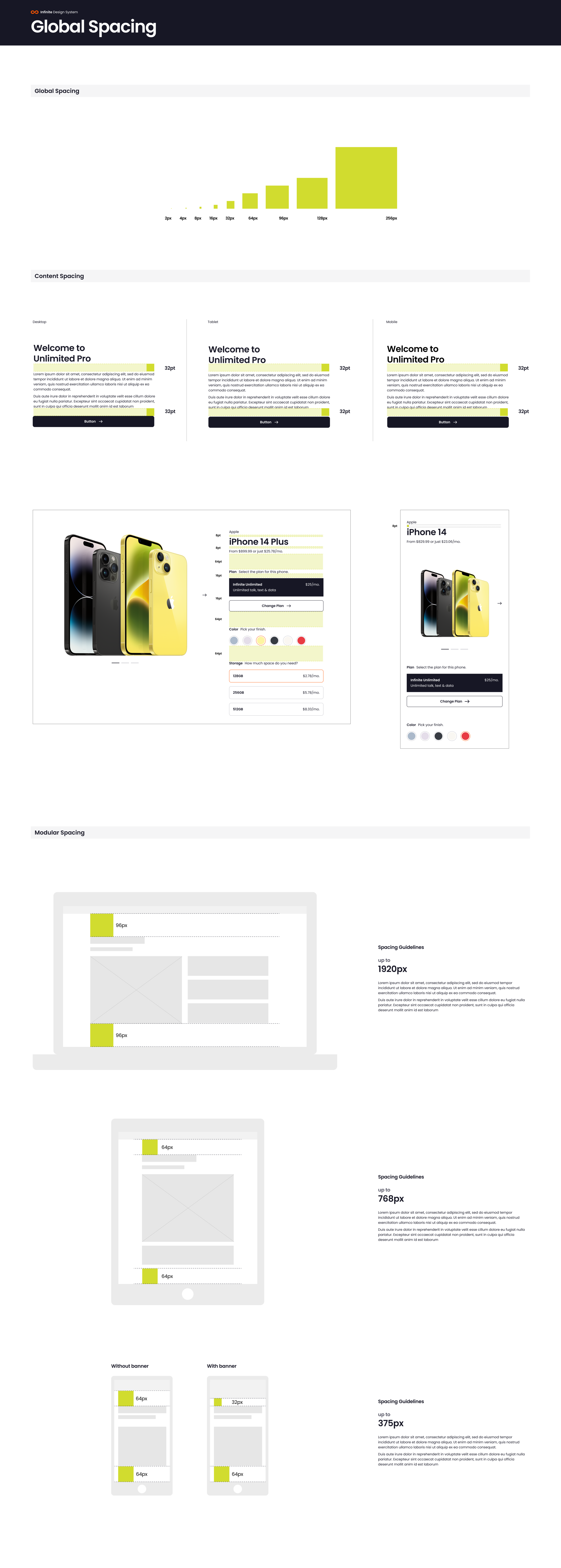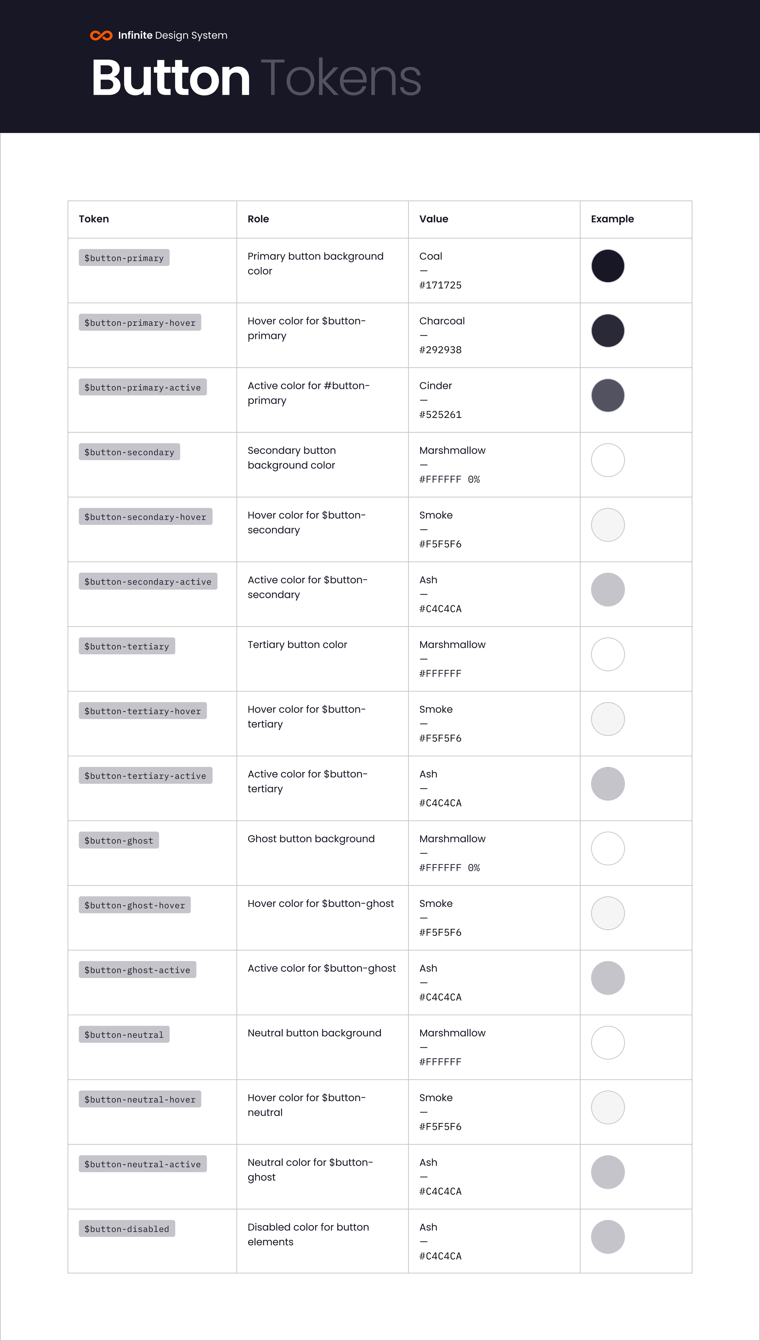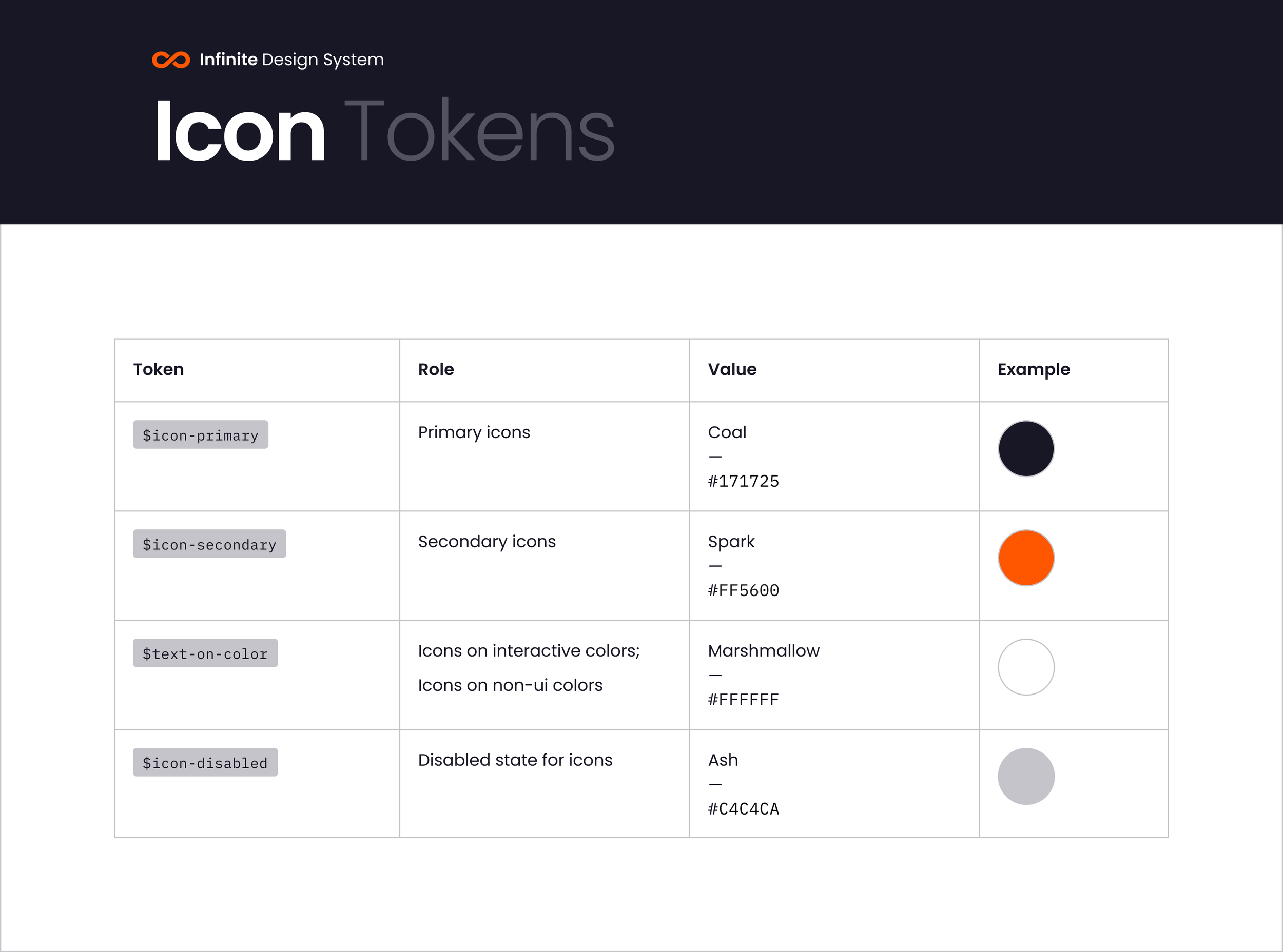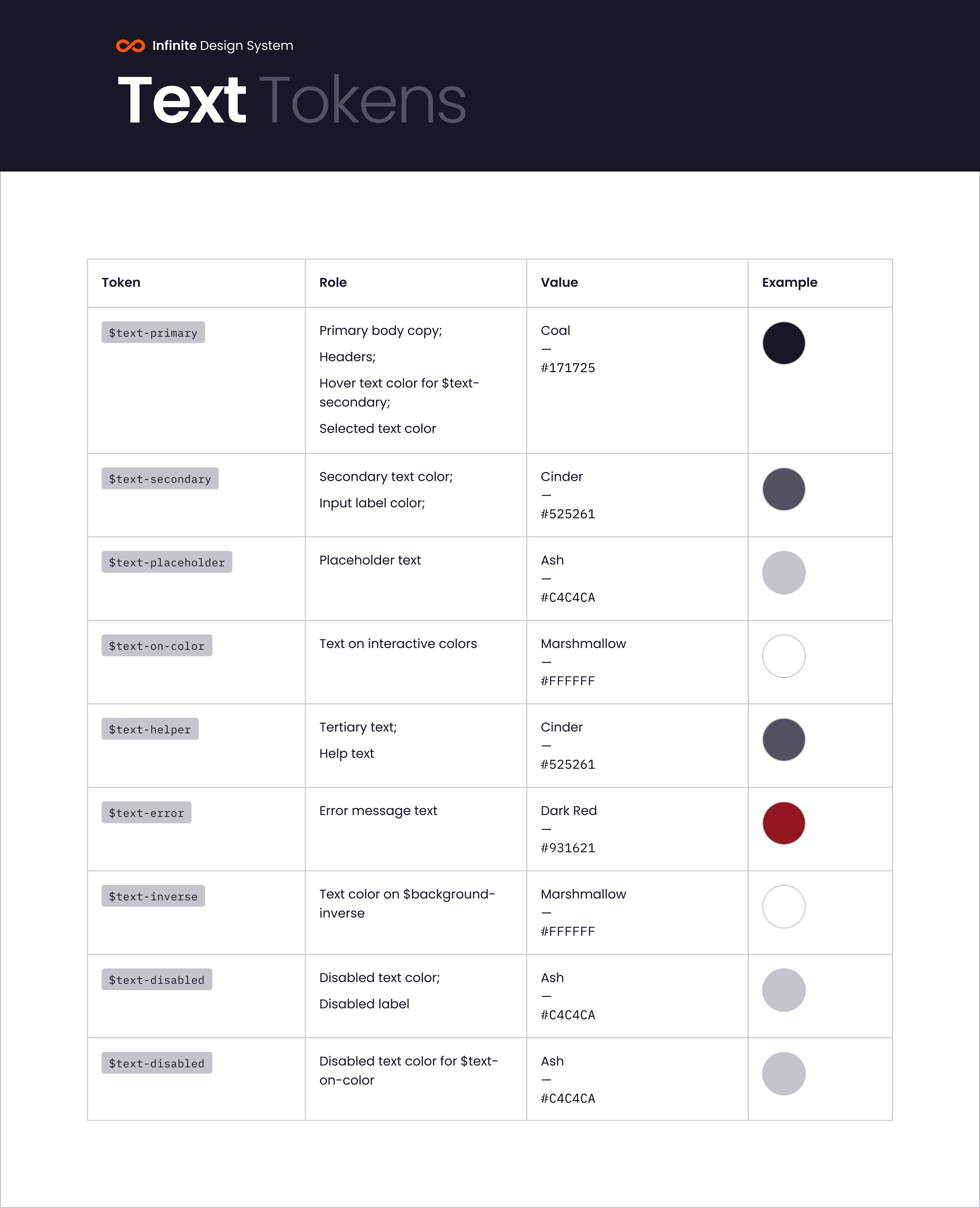 In the process of creating tokens, we based our system on Carbon by IBM. Carbon offered a good amount of preset Tokens that made it easier to adapt our system into. But, by using Carbon, we also had to adapt and add new tokens, as we wanted a very catered design system that feels original and unique to the Infinite brand, while creating a system that supports our team and the distinctive features we needed, that weren't available on Carbon out of the box.